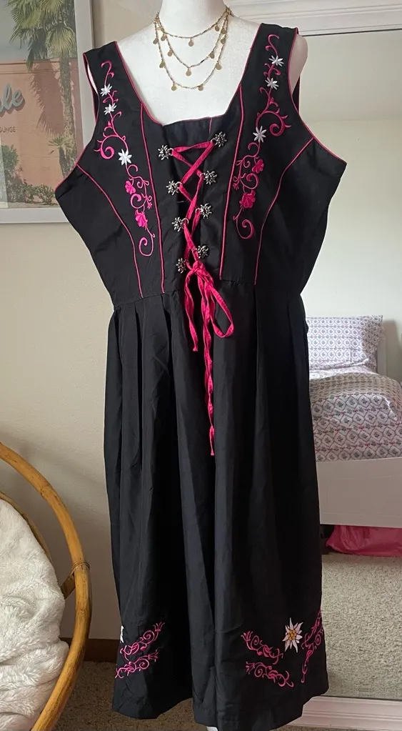— Gently used, has some stray thread/fuzzies Black with hot pink white embroidered floral print Size 50 converts to US 20 — Approx. Measurements 23” pit to pit 20.5” flat waist 45” length — Embroidered flowers Midi length Sleeveless tank Lace up corset style with metal pieces — German Oktoberfest ren fair renaissance faire whimsigoth whimsical dark romantic goth Valentine’s Day cottagecore prairie festival plus size