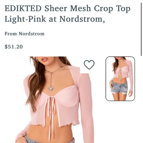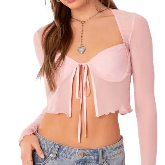 New, adjustable strap, wired, sheer mesh, lettuce trim. Make a flirty, retro statement in this gauzy tie-front top featuring long sleeves and a cropped length. Sweetheart neck Long sleeves 95% polyester, 5% spandex Machine wash, dry flat Imported