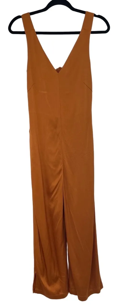 EDUN Women's Burnt Orange Rust Satin V-Neck Wide Leg Jumpsuit Size XS This exquisite jumpsuit featu... Show more