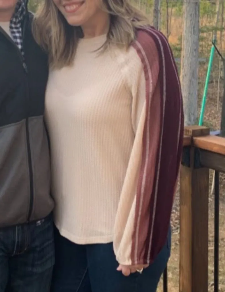 Excellent like new condition Waffle knit Try color striped sleeves Balloon sleeve style Size l... Show more