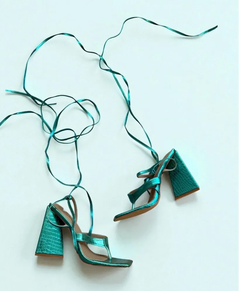 Elevate your style with these stunning EGO teal metallic lace-up block heels. Designed for comfort a... Show more