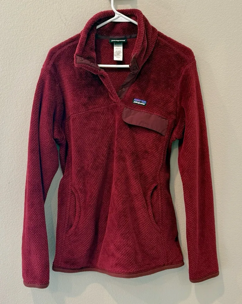 Warm Patagonia fleece jacket in maroon. Features a stylish half-zip and convenient front pockets.