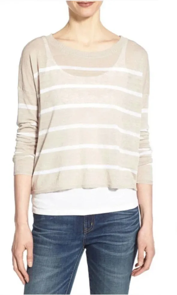 Eileen Fisher Crepe Stripe Linen Blend Knit Crop Sweater in Tan and White Lovely crop top done in fi... Show more