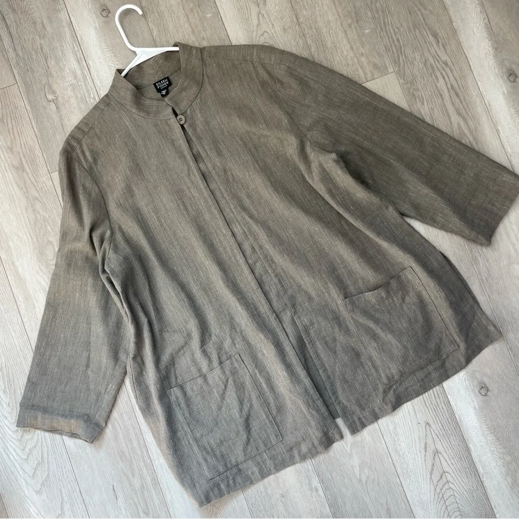 Eileen Fisher Cotton Linen Jacket in the color Tan. Single button closure at neckline, open front, l... Show more