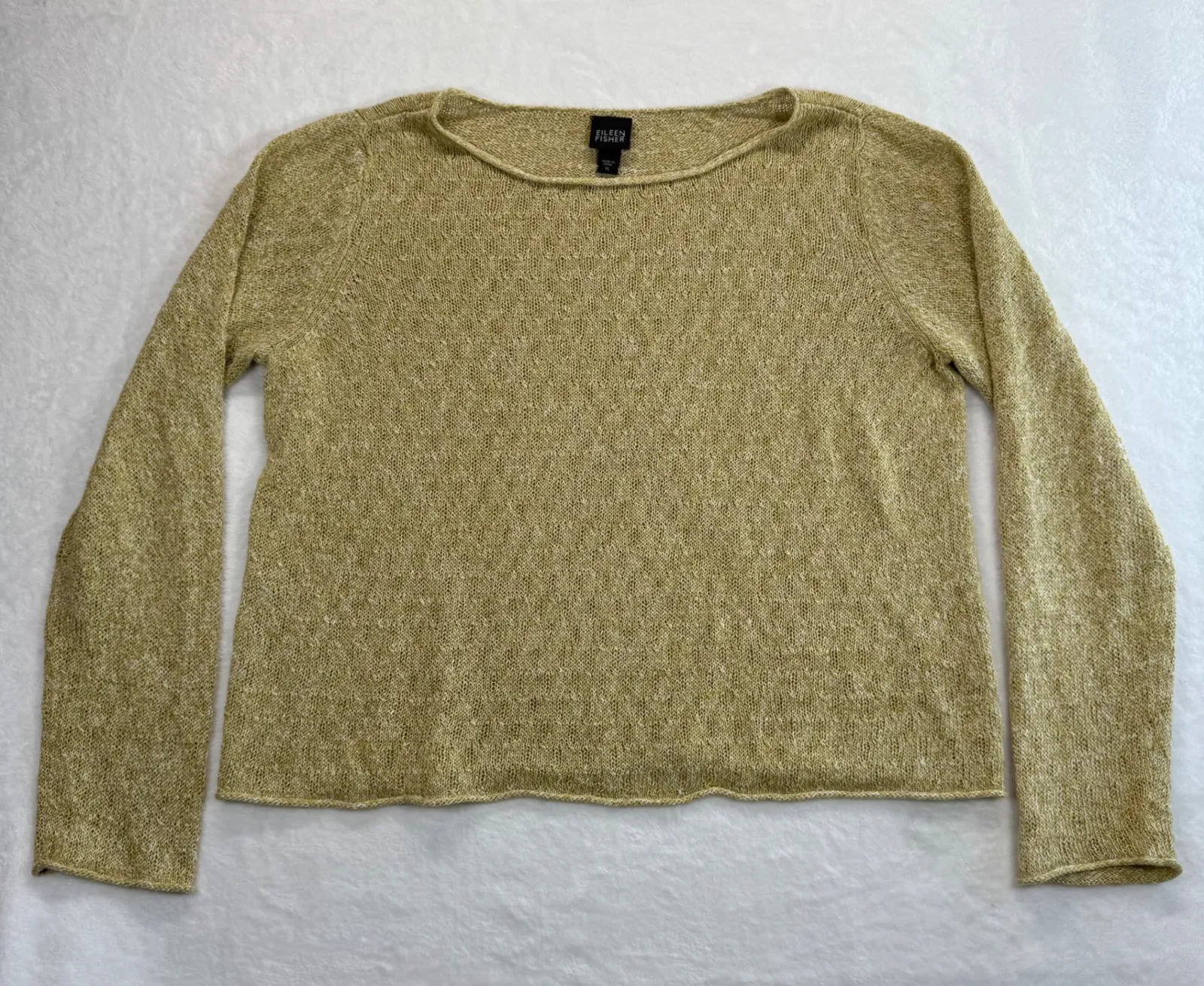 Keywords: Eileen Fisher sweater, linen sweater, knit sweater, gold sweater, tunic top, womens sweater, long sleeve sweater, lightweight sweater, designer sweater, casual sweater, comfortable sweater, XL sweater, Eileen Fisher top, linen knit top, open knit, coastal, beachy, minimalist, quiet luxury, closet staple, capsule wardrobe