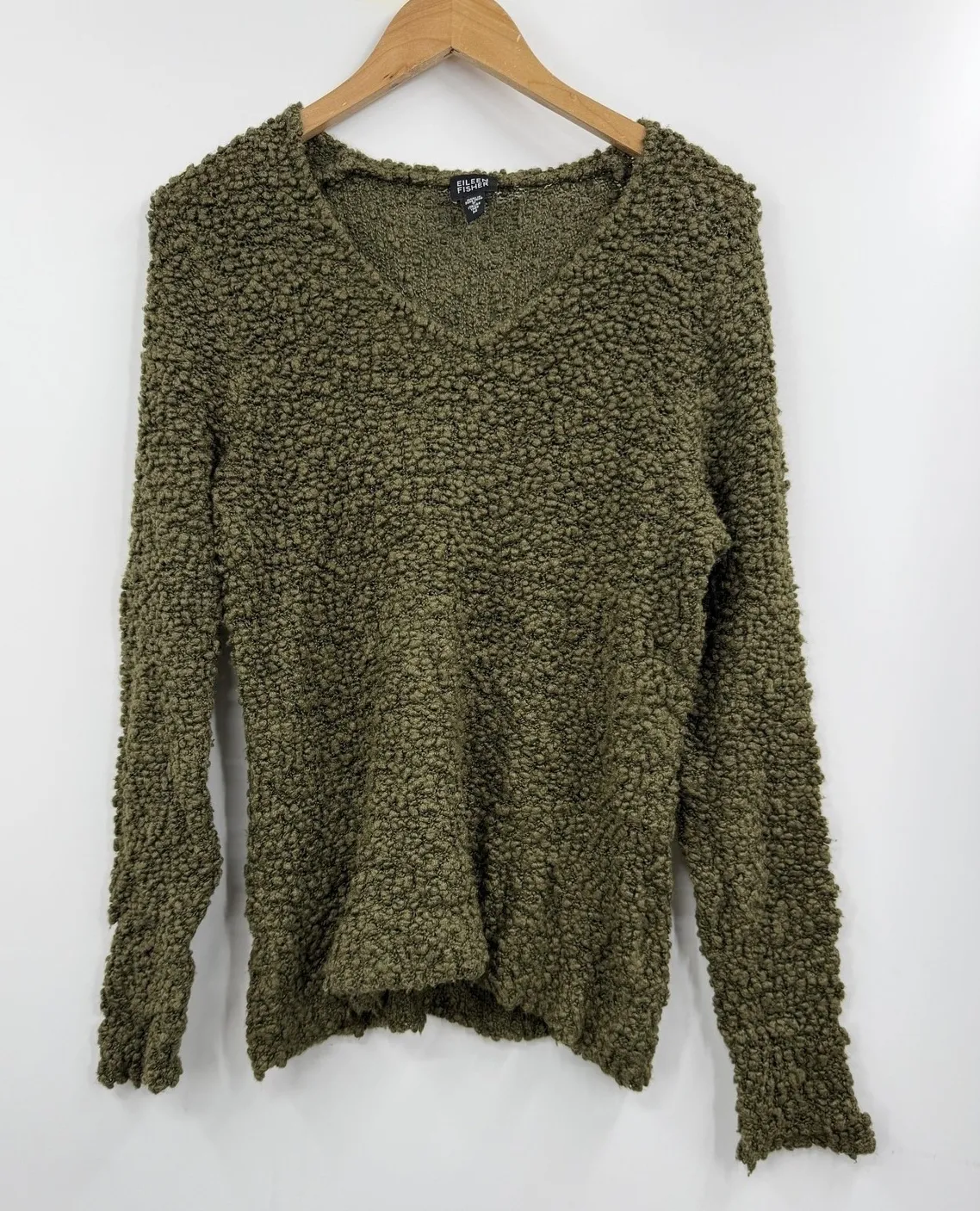 Keywords: Eileen Fisher, merino wool sweater, textured knit, v neck sweater, olive green sweater, designer sweater, wool blend sweater, long sleeve sweater, womens sweater, cozy sweater, classic sweater, minimalist, luxury