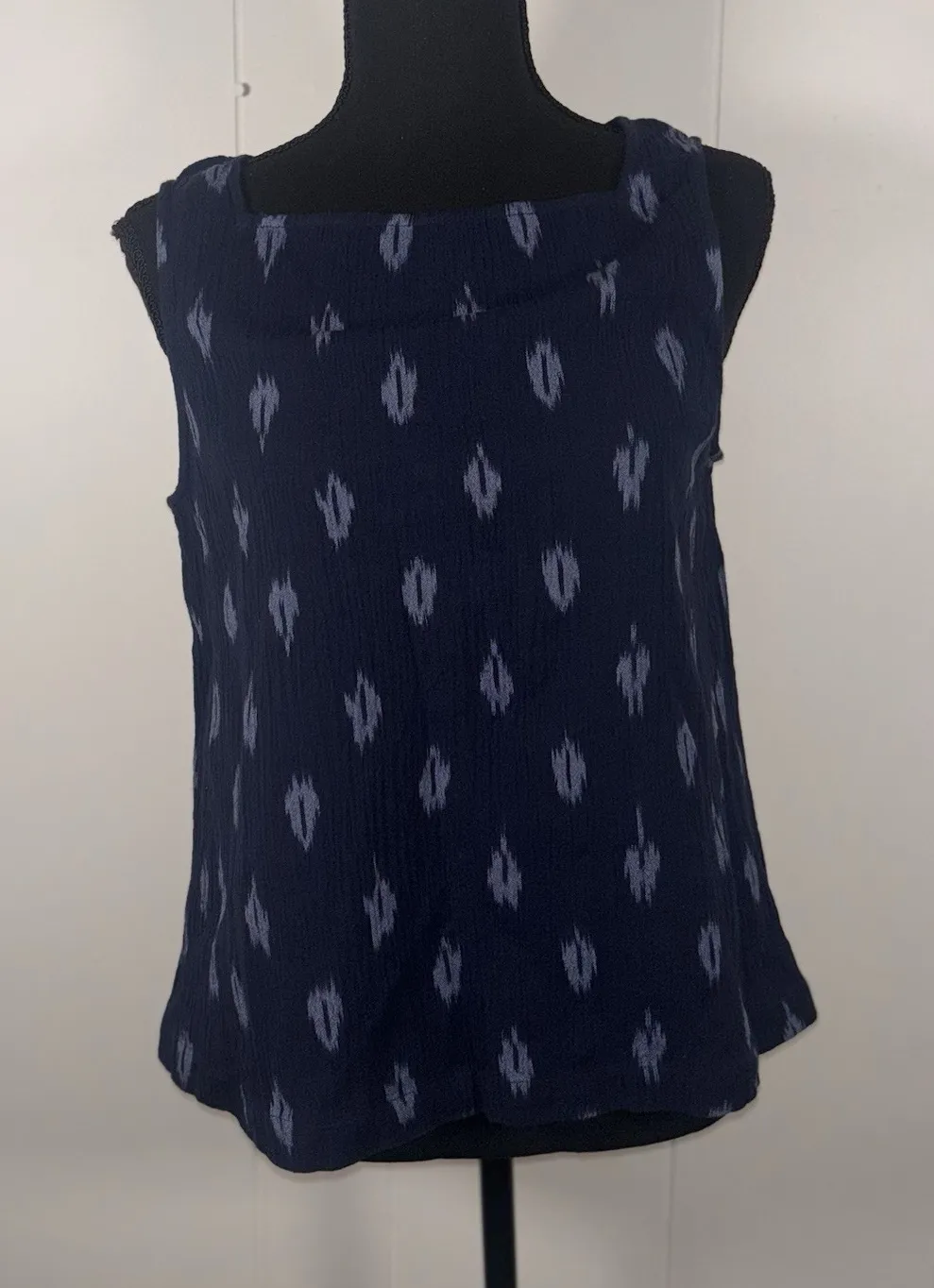 The EILEEN FISHER Midnight Blue Cotton Ikat Petal Sleeveless Shell Tank Top in size small is a styli... Show more