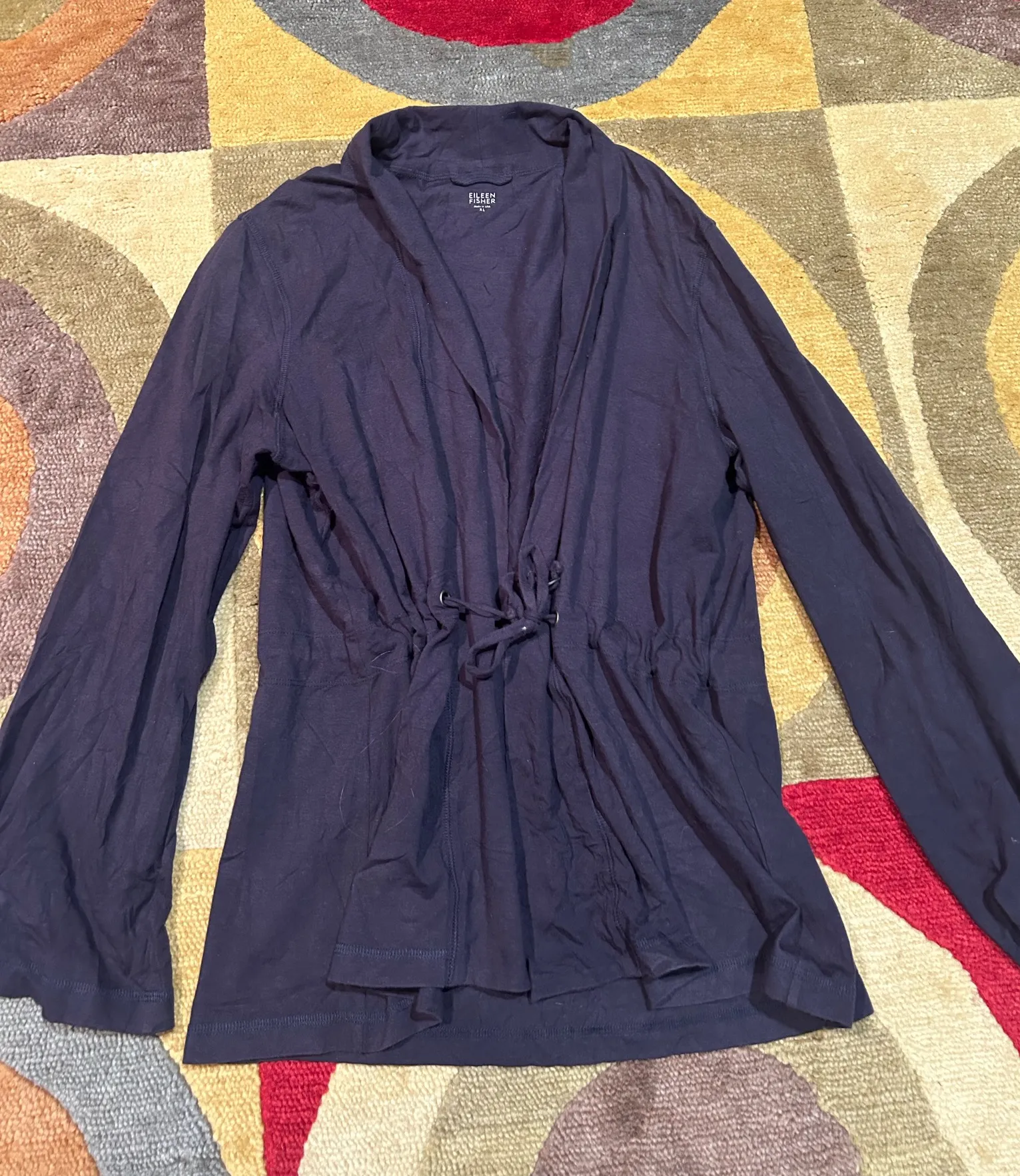 Eileen Fisher Navy Blue Tie Waist Stretchy Knit 90% Organic Cotton Cardigan Women’s Size XL PLEA... Show more