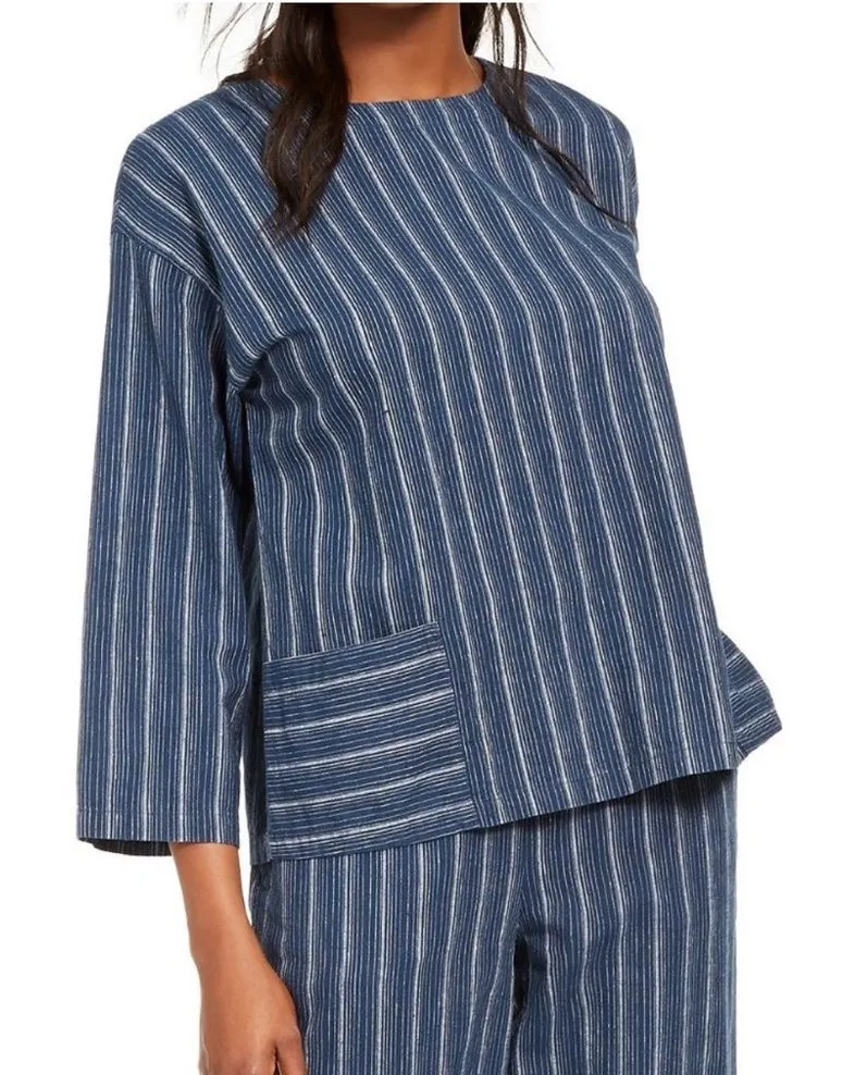 Elegant navy garment with subtle white stripes. Perfect for a chic, relaxed look.