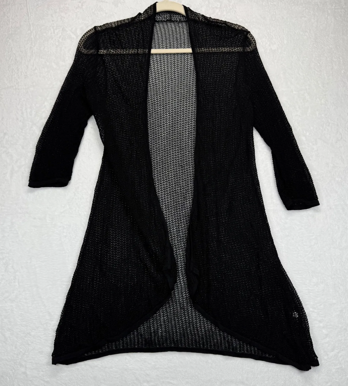 Keywords: Eileen Fisher cardigan, black cardigan, open front cardigan, duster cardigan, lightweight cardigan, knit cardigan, cover up, viscose cardigan, size A, minimalist style, classic cardigan, comfortable cardigan, black knitwear, long cardigan, prairie, cottagecore, closet staple, capsule wardrobe, lagenlook