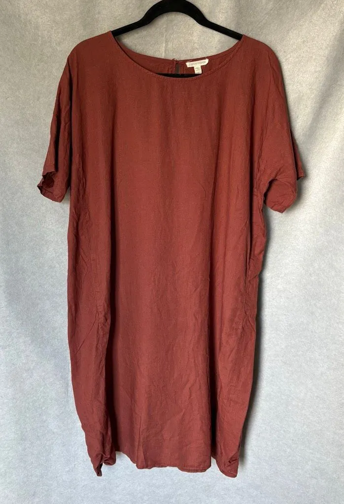 Eileen Fisher organic linen shift dress in a deep terra cotta tone. Natural, minimalist lagenlook st... Show more