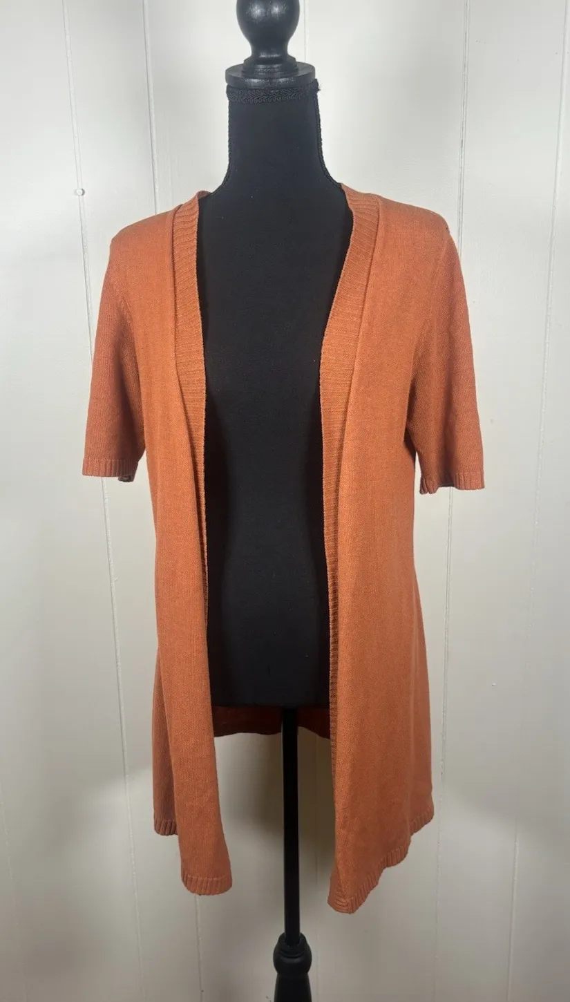 The product is a stylish Eileen Fisher short sleeve cardigan shrug in a vibrant orange color, made o... Show more
