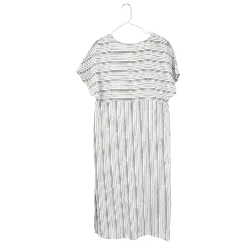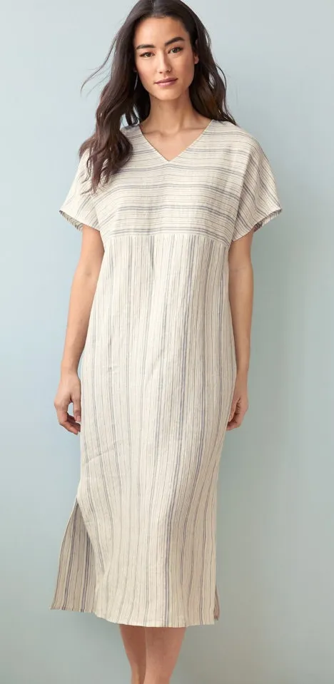 Bring breezy beach style to bed. This chic caftan gown exudes graceful ease in lightweight washed organic linen, with beautiful styling (empire waist and high side vents) and variegated stripes in a crisp, coastal-inspired color. Size: Small Color: White and Gray By EILEEN FISHER and Garnet Hill Garment washed for softness Relaxed fit Pull-on style V-neckline Dolman sleeves Empire waist seam High side vents Midi length 100% organic linen Imported This item is in excellent pre-owned condition. Please see all photos for signs of wear. Always happy to answer any further questions.