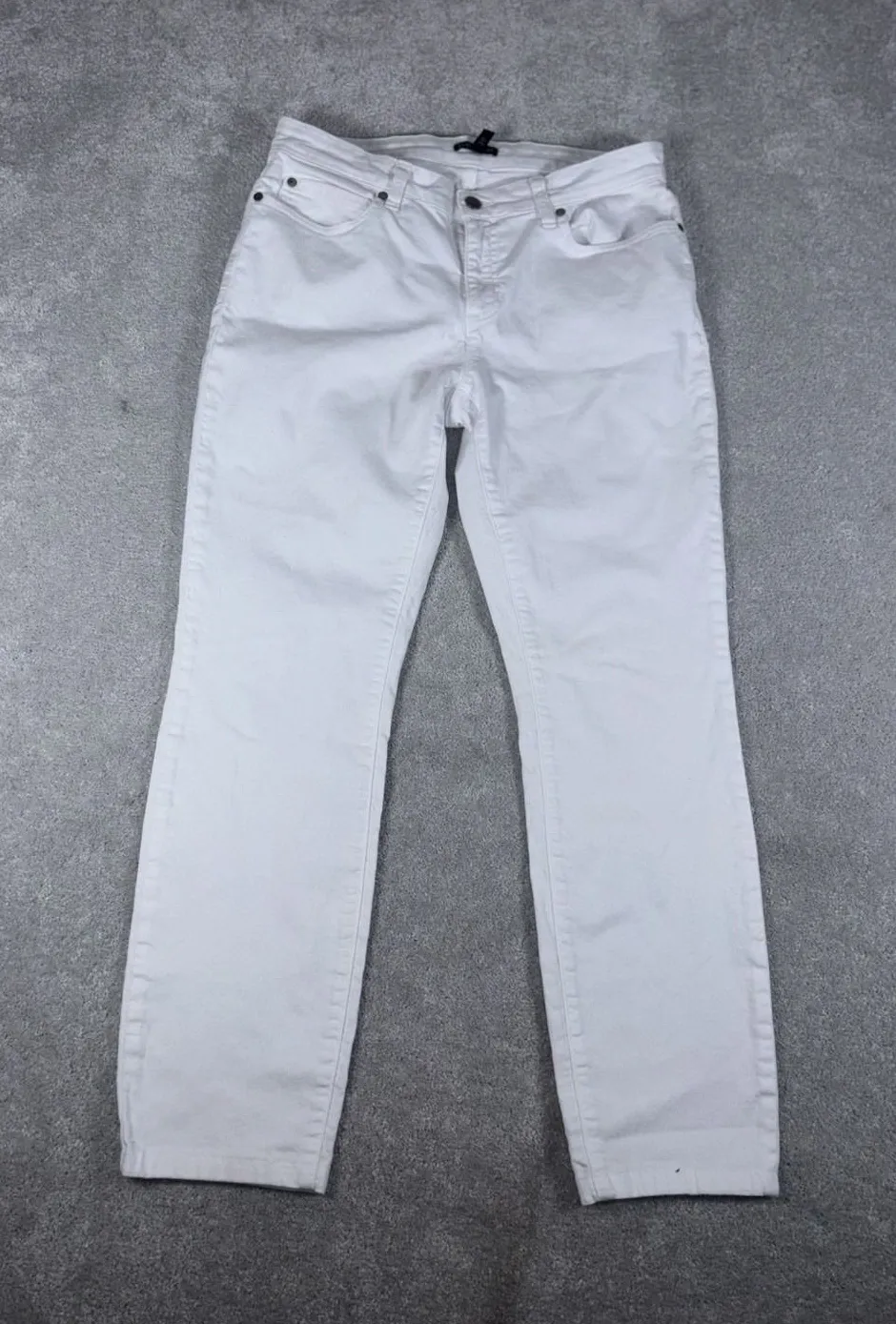 The product is a pair of Eileen Fisher slim straight leg jeans in white, made from organic cotton. T... Show more