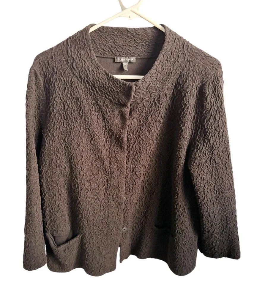 Eileen Fisher Woman size L black textured knit snap hidden button cardigan Excellent condition