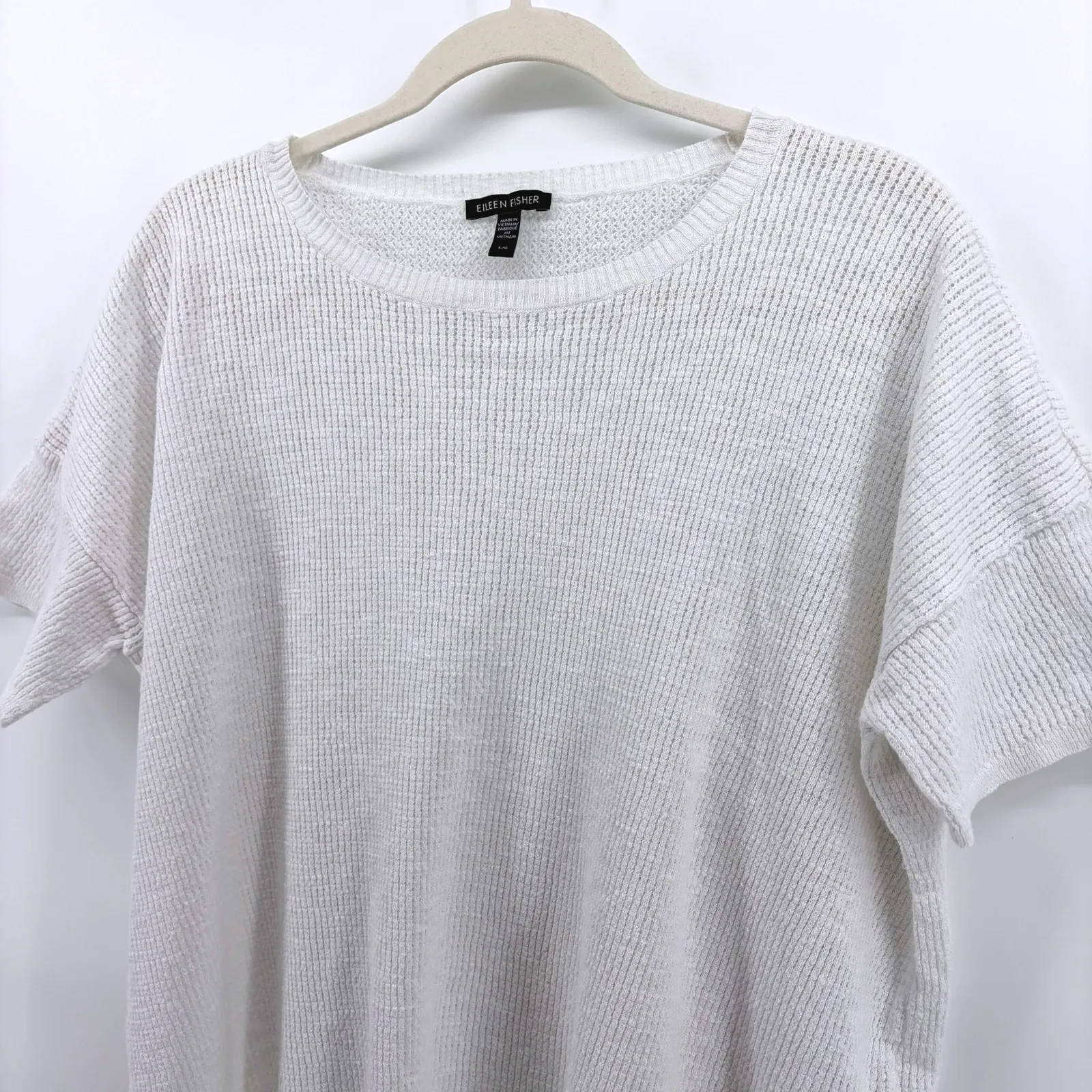 Eileen Fisher knit sweater top in white. This short sleeve sweater features a crew neckline and a te... Show more