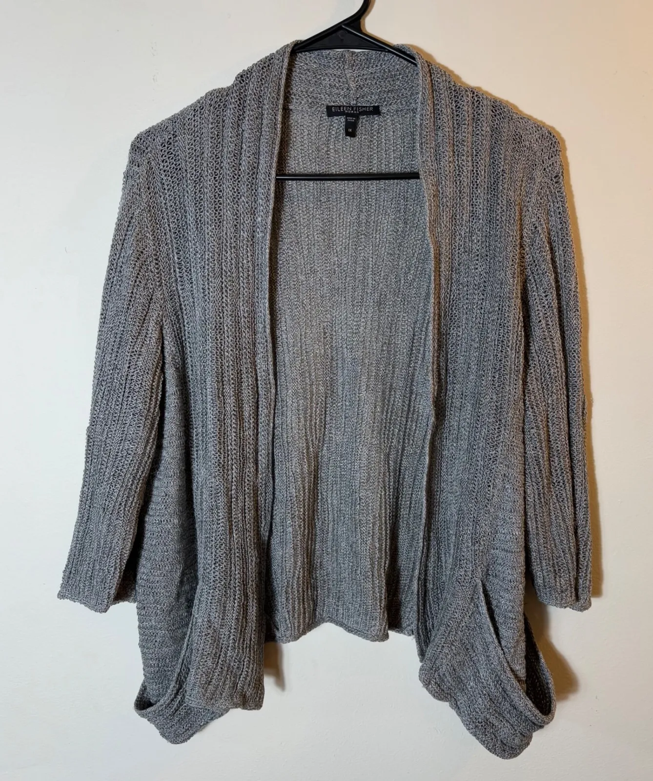 Keywords: Eileen Fisher, cardigan, sweater, linen silk blend, open front, gray, 1X, woman, knit, plus size, relaxed fit, casual, office, layering piece