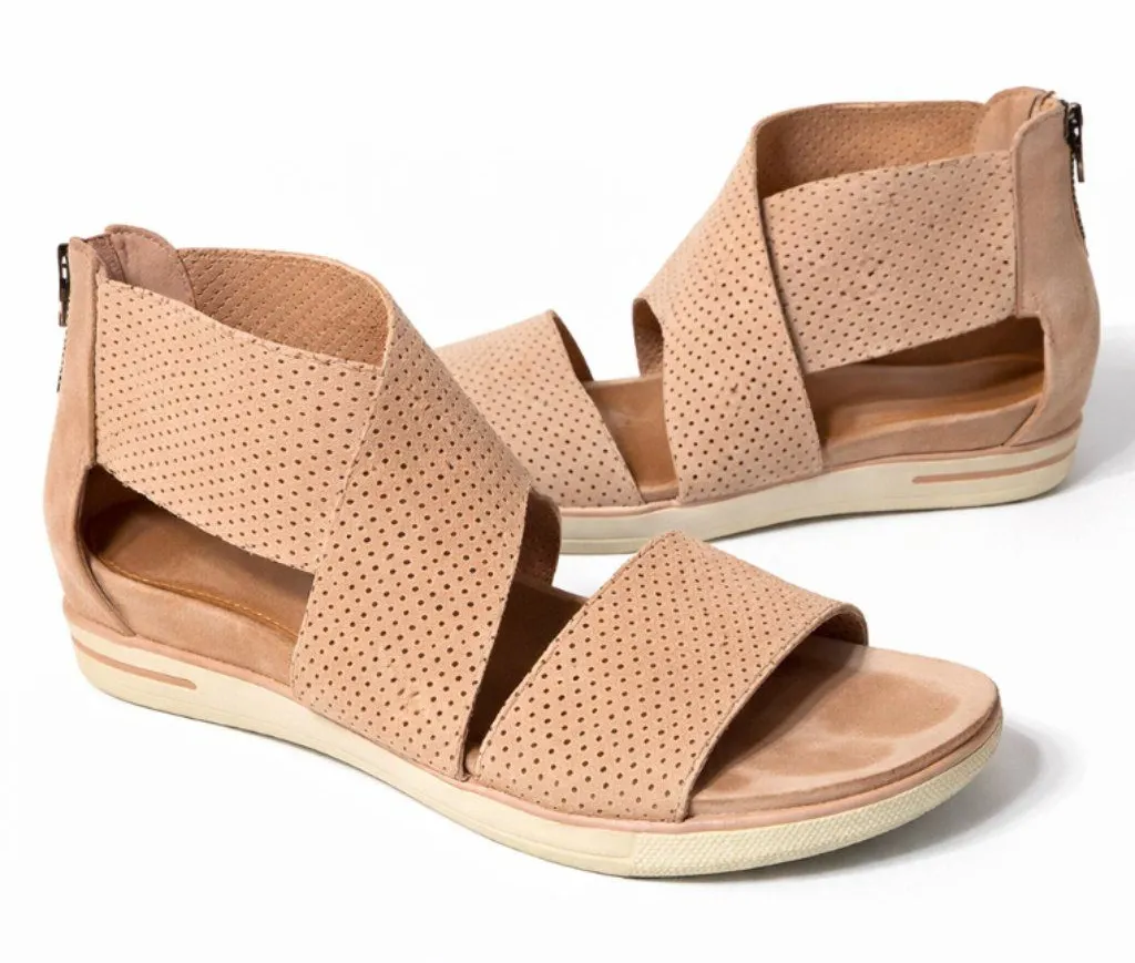 Minimalist Eileen Fisher sandals crafted from soft, perforated leather in a neutral tone. Features w... Show more