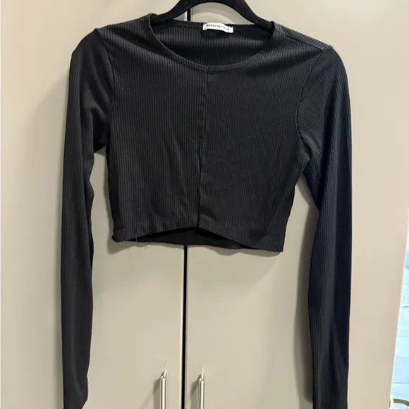 This sleek black blouse from Reformation features a fitted design with long sleeves and a cropped cu... Show more