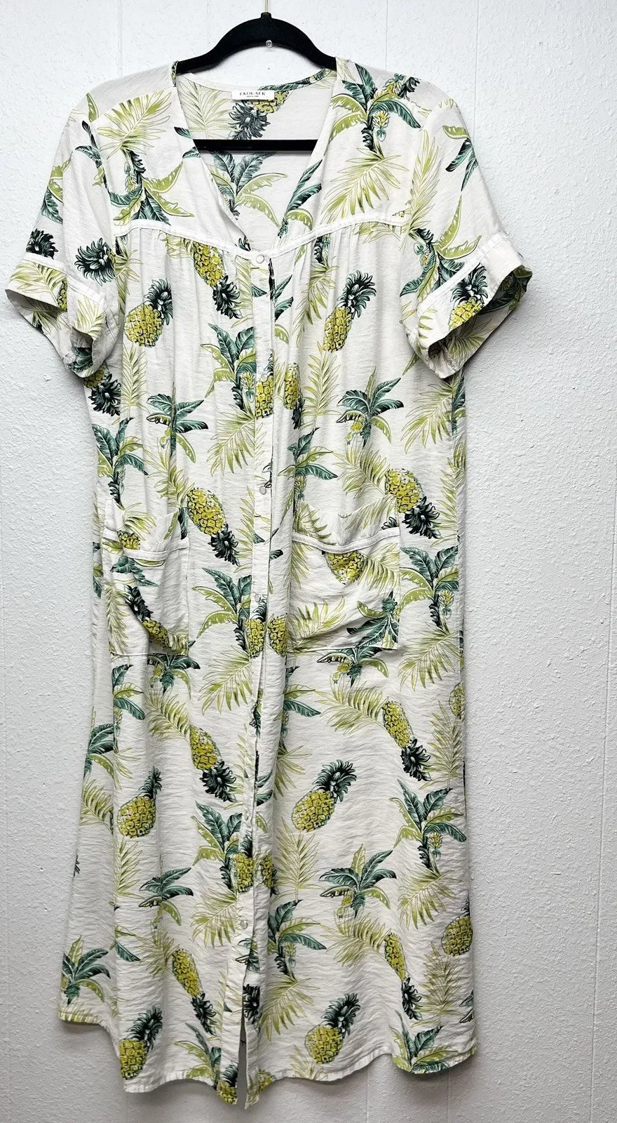 Ekouger women's tunic dress. Novelty pineapple tropical print. V-neck. Button down. Short sleeves. Front pockets. Maxi length. Unlined. Lightweight. In good used condition. No stains, tears or holes. Cotton spandex blend. Machine wash. spring summer casual coastal beachy nautical vacation cruise tropical