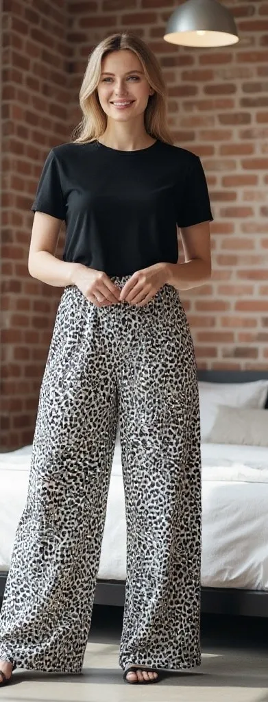 Embrace effortless style and ultimate comfort with this chic pajama set. Relaxed elegance defines this two-piece ensemble featuring a classic black tee and statement leopard print wide-leg pants. The flowy design is both flattering and comfortable. The elastic waistband ensures a perfect fit, while the relaxed silhouette allows for unrestricted movement. Perfect for lounging at home on a lazy Sunday morning, enjoying a casual brunch with friends, or even elevating your work-from-home wardrobe, this set blends fashion and relaxation seamlessly. Measurements: • Pants Waist: 17" (unstretched, laying flat, approx. 34" total) • Pants Inseam: 31" • Top Pit to Pit: 25" • Top Shoulder to Hem: 26" Color: Black Department: Women Set Includes: T-Shirt, Pants Number of Pieces: 2 Piece Material: 100% Polyester Character Family: Animal Print Season: Fall, Spring, Summer Fabric Type: Rayon Character: None Occasion: Casual Sleeve Length: Short Sleeve Pattern: Animal Print Type: Outfit/Set Keywords: pajama set, loungewear, women's pajamas, leopard print, wide leg pants, plus size, 2XL, Ekouaer, sleepwear, comfortable pajamas, casual wear, black top, animal print, relaxed fit