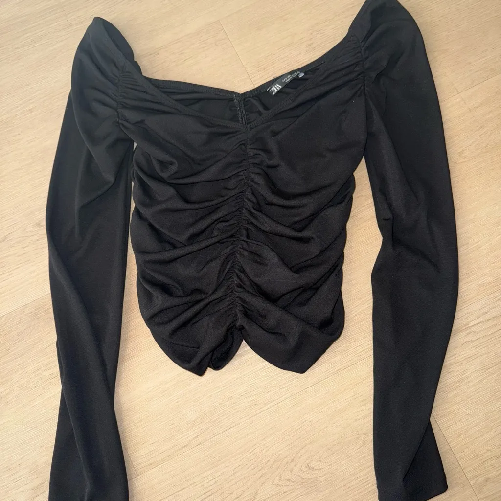 Chic black blouse with ruched detailing. Long sleeves and elegant design.