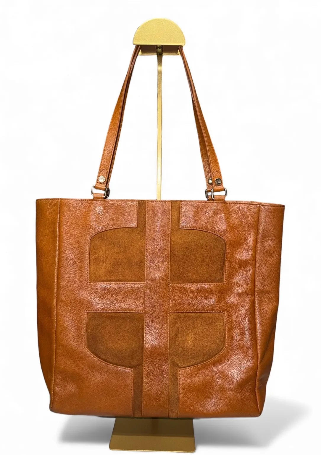 Discover effortless chic with this exquisite Elaine Turner tote bag. Crafted from supple brown leather, its generous silhouette is artfully accented with rich suede panels, creating a sophisticated textural contrast that elevates any ensemble. The vibrant fuchsia branded lining adds a playful pop of color and showcases thoughtful interior organization with multiple slip pockets and a secure zippered compartment, ensuring your essentials are always within reach. Carry it comfortably over your shoulder with its smooth leather straps, perfect for your daily commute, weekend errands, or a stylish lunch date. Measurements: • Height: 13 in • Width: 12 in (front) • Depth: 3 in (sides) • Drop: 10 in Exterior Material: Leather, Suede Style: Tote Exterior Color: Cognac Department: Women Lining Color: Pink Handle/Strap Material: Leather Handle/Strap Color: Brown Lining Material: Fabric Hardware Color: Gold Bag Height: 13 in Bag Depth: 3 in Accents: Stitching, Zipper Features: Inner Pockets, Pockets, Lined Keywords: Elaine Turner, leather tote, suede detail, shoulder bag, womens handbag, designer tote, everyday bag, work bag, shopping bag, classic style, luxury tote, structured bag