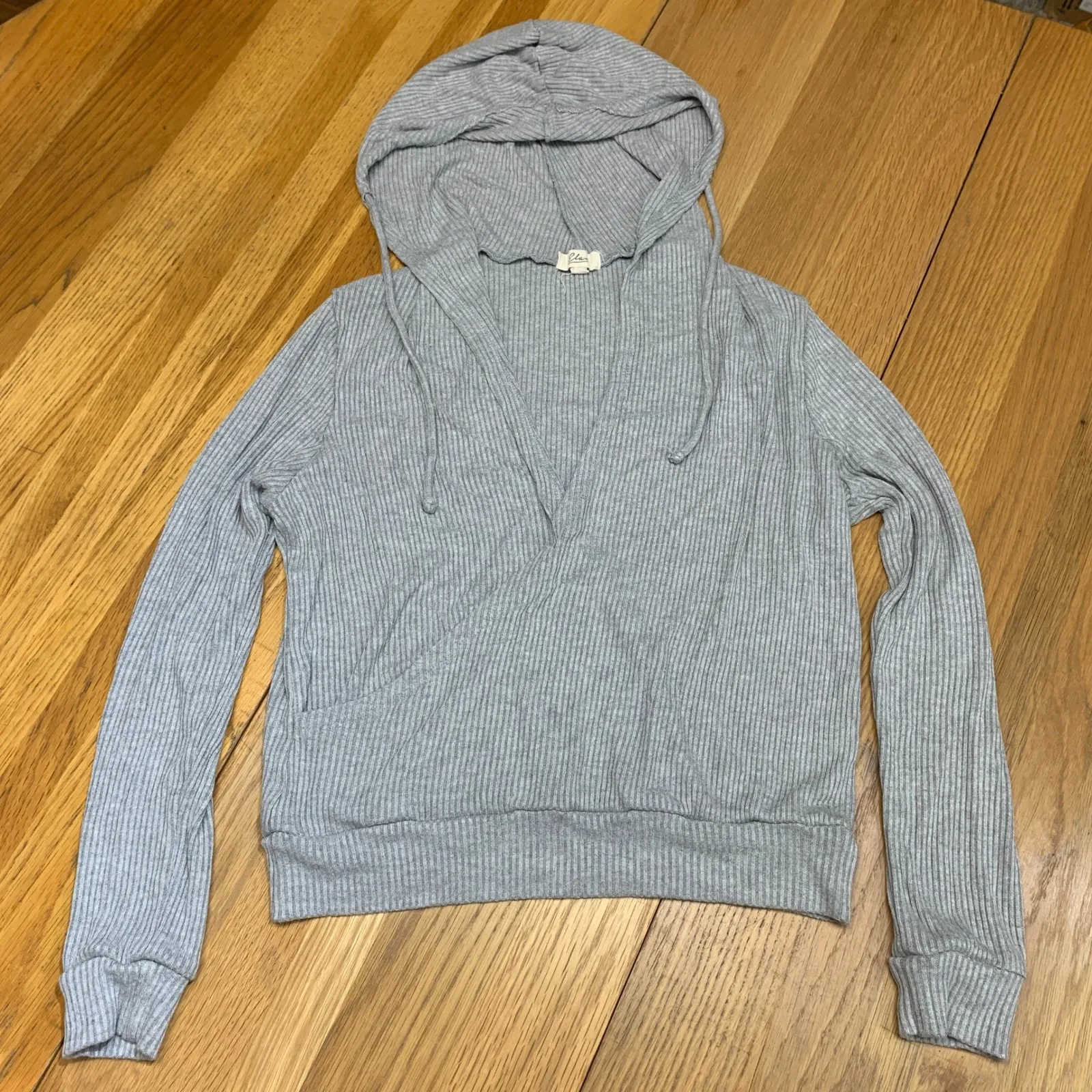 A women's gray ribbed hoodie pullover from Elan. This long-sleeve top features a V-neckline with a drawstring closure and a comfortable hood. The ribbed texture adds visual interest and a soft feel. Designed for a casual and relaxed fit. Keywords: Elan, hoodie, pullover, V neck, ribbed, gray, long sleeve, casual, women's, loungewear, athleisure, comfy, basic, layering, anthropologie Very good used condition. Open to offers!