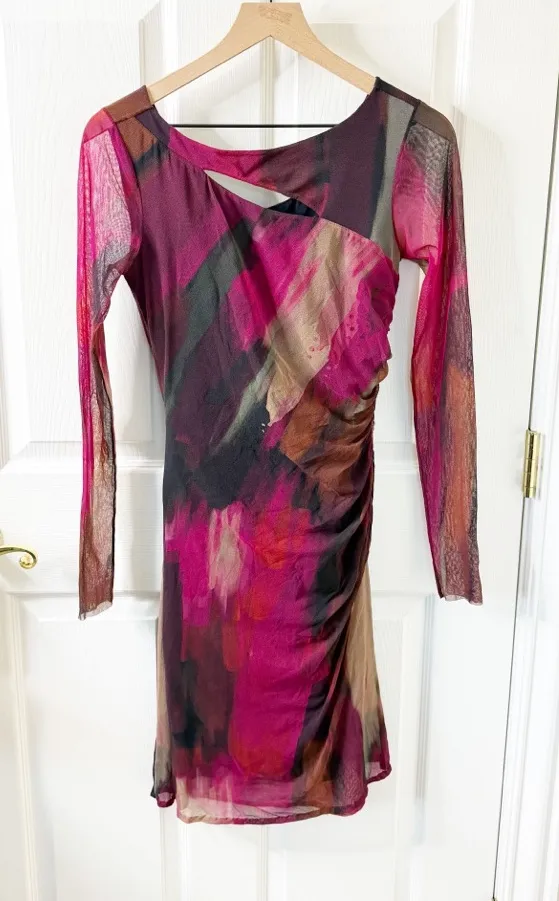 Elana Kattan Mesh Overlay Abstract Pink Cutout Mini Dress Long Sleeve Ruched S - $36 - From Stephanie