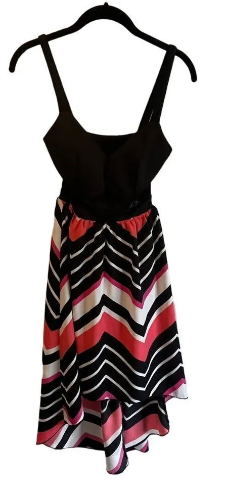 Make a statement in this stunning sundress featuring a classic black fitted bodice and a vibrant chevron-printed skirt in coral, pink, black, and white. The spaghetti straps and sweetheart neckline create an elegant silhouette, while the flowy skirt adds movement and grace. Perfect for summer parties, beach vacations, date nights, or any special occasion where you want to combine comfort with style. Keywords: chevron dress, summer dress, sundress, black bodice, coral dress, spaghetti strap dress, flowy dress, party dress, geometric print, sweetheart neckline, cocktail dress, fitted bodice dress