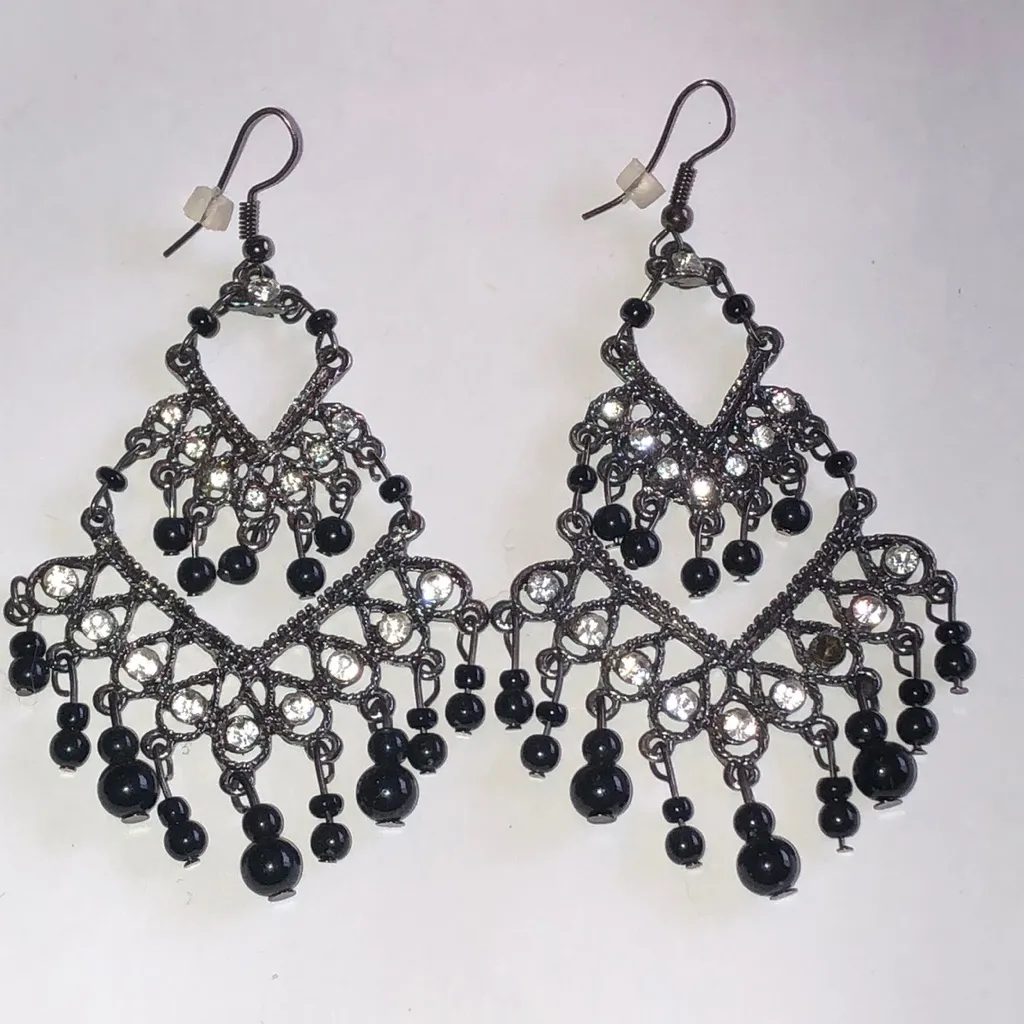 These stunning chandelier earrings feature a captivating black and dark metal design, perfect for adding a touch of elegance to any outfit. Ideal for special occasions or a night out. Good condition but missing one rhinestone as shown Approximately 2” x 3.5” A5 Chic Boho Vintage Street Style Minimalist Statement Piece Essential Trendy Fashion Forward Must-Have On-Trend Cute Casual Edgy Classic Rare Find retro mid century modern estate jewelry costume jewelry