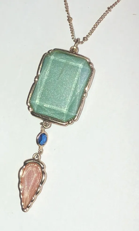 This elegant necklace features a stunning green pendant complemented by a blue accent, perfect for adding a touch of sophistication to any outfit. Good condition. Approximately 3” pendant 28” chain 3” extender S9 Boho Vintage Street Style Minimalist Statement Piece Essential Trendy Fashion Forward Must-Have On-Trend Cute Casual Edgy Classic Rare Find retro mid century modern estate jewelry costume jewelry