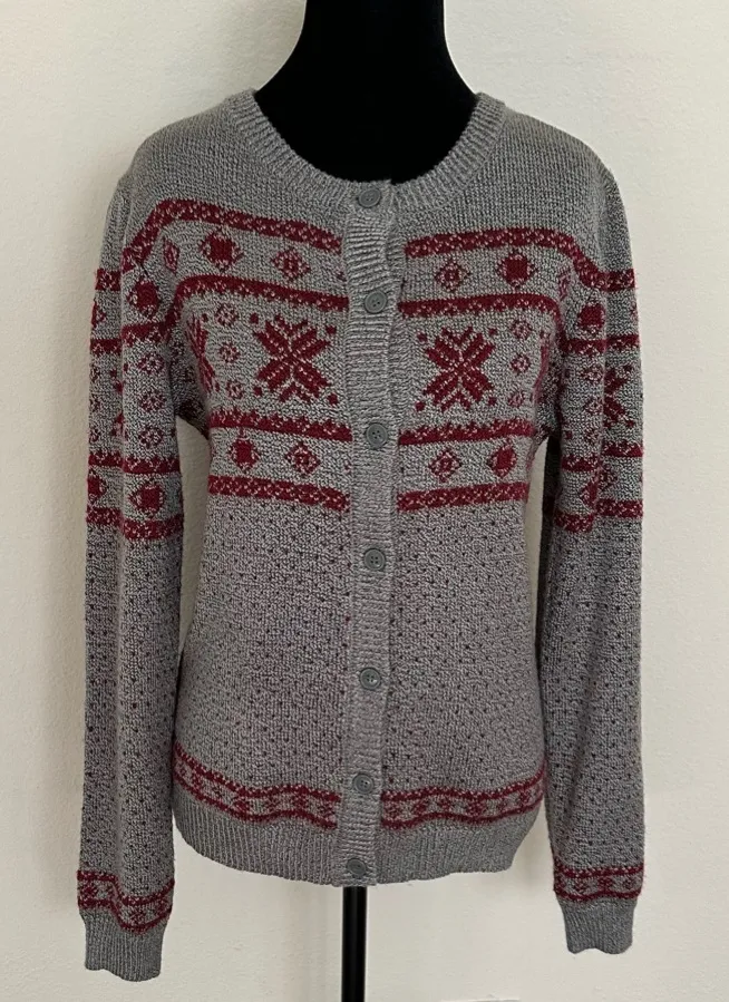 Elevate your wardrobe with this elegant gray and red patterned cardigan. By Design Sweater, Size M This knitted sweater features a charming winter design in shades of gray and wine, perfect for the colder months. It has a button-front closure, a round neck, and ribbed cuffs and hem for a comfortable and stylish fit. Made from 84% acrylic and 16% polyester, it's soft, warm, and easy to care for. Perfect for pairing with jeans or skirts for a cozy and elegant look.