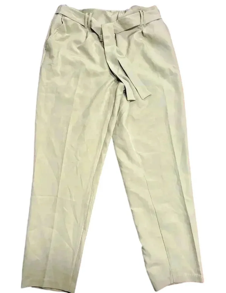 These sophisticated sage green trousers combine style with versatility. Features include a flattering high-waisted cut, elegant pleating, and a coordinating belt detail. Perfect for office wear, business meetings, or dressy casual occasions. The relaxed fit through the legs creates a polished silhouette while maintaining comfort. Pair with a crisp white blouse for work or a fitted sweater for more casual settings. Keywords: sage green trousers, high waisted pants, pleated trousers, belted pants, office wear, business casual, dress pants, professional wear, work pants, formal trousers