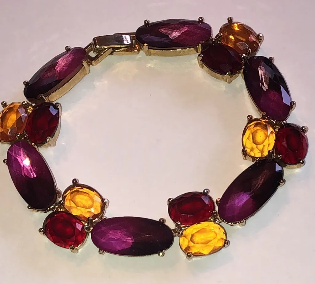 This stunning bracelet features a vibrant mix of purple, red, and yellow gemstones, perfect for adding a pop of color to any outfit. Its elegant design makes it a versatile accessory for both casual and formal occasions. Good condition Approximately 7” D1 Boho Vintage Street Style Minimalist Statement Piece Essential Trendy Fashion Forward Must-Have On-Trend Cute Casual Edgy Classic Rare Find retro mid century modern estate jewelry costume jewelry
