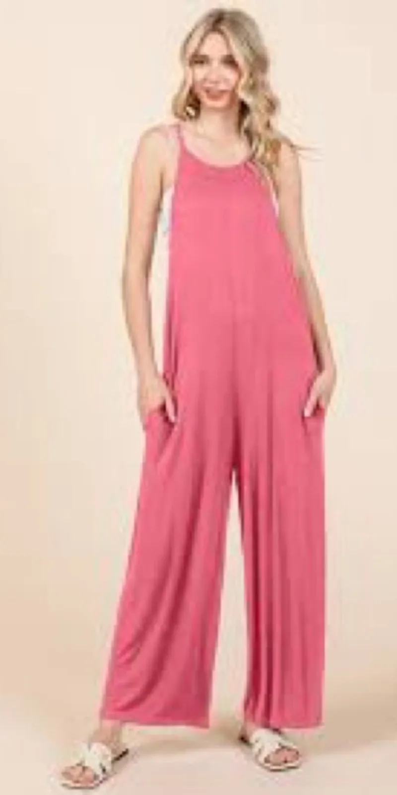 This elegant pink jumpsuit with adjustable straps is perfect for any occasion. Its flowing design offers comfort and style, making it a must-have in your wardrobe. Size XL. Pockets. Soft fabric. Length 54.5” chest 23” flat armpit to armpit.