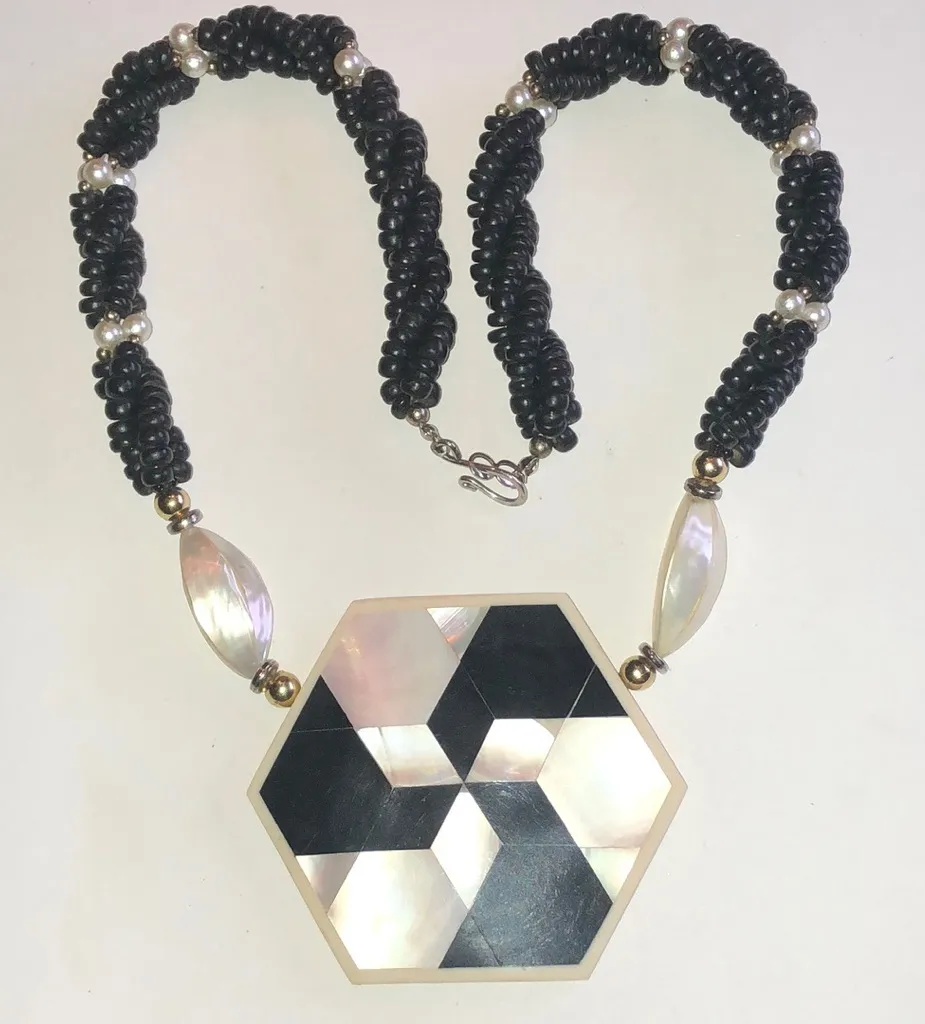 This stunning necklace features a bold geometric design in black and white, perfect for adding a touch of elegance to any outfit. The intricate beadwork and unique pattern make it a standout piece in any jewelry collection. Good condition. Inlaid mother of pearl pendant, beads are glass Approximately 2.75” pendant 18” chain G4 Boho Vintage Street Style Minimalist Statement Piece Essential Trendy Fashion Forward Must-Have On-Trend Cute Casual Edgy Classic Rare Find retro mid century modern estate jewelry costume jewelry