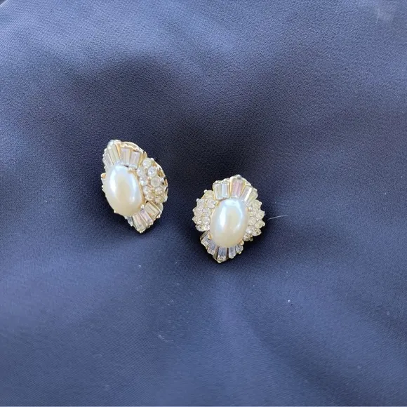 These elegant earrings feature a stunning gold setting. Elevate your accessory collection with these Vintage Crystal and Faux Pearl Earrings, exuding timeless elegance. Each earring features a meticulously crafted design, highlighting an oval shape. The brilliant interplay of crystal catches the light, creating a mesmerizing sparkle that complements any look, whether it's for an anniversary, a festive occasion like Christmas, or a wedding. *back not included * The earrings are a tasteful addition to both day and evening ensembles, seamlessly blending with a variety of styles. With their classic prong setting and round main stone shape, these unbranded stud earrings offer a touch of sophistication without overwhelming your outfit. They are a testament to the charm of vintage costume jewelry, making them a perfect choice for those who appreciate the allure of yesteryear's fashion.