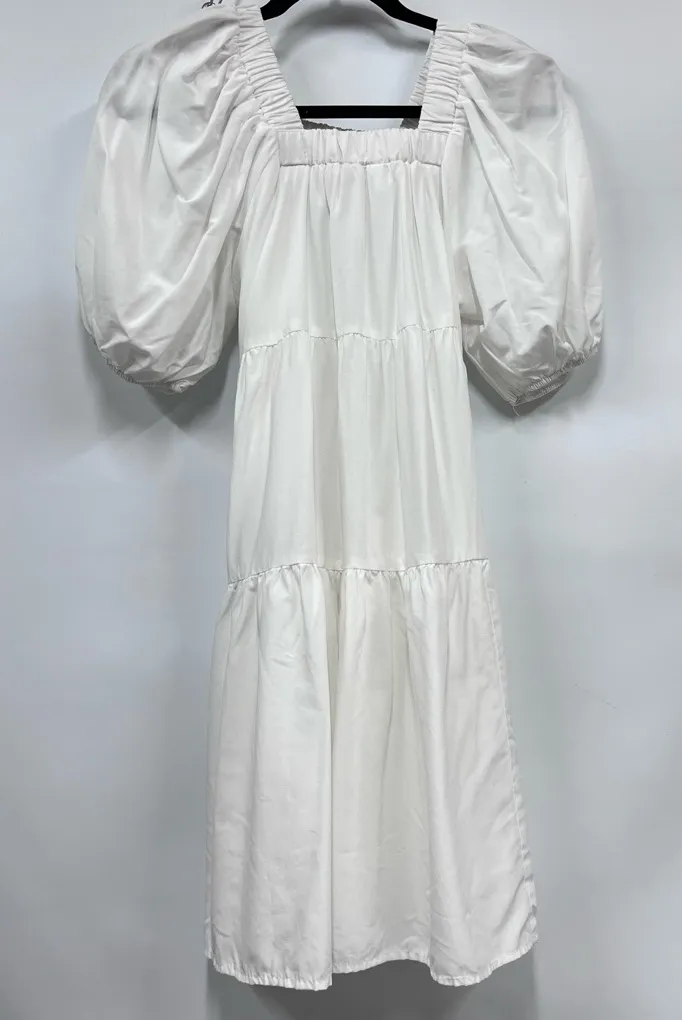 Tiny flaws see pics. See pics of measurements to ensure fit. This elegant white dress features stylish puff sleeves and a tiered design, perfect for any occasion. Its classic white color adds a touch of sophistication to your wardrobe.