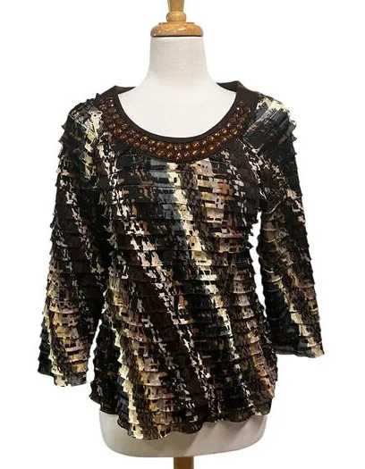 Brand: Elementz Size: M Material: Polyester/spandex Color: Brown/neutrals Style: classy, mature, Lagenlook, office, embellished, lightweight Fit: round neckline, 3/4 sleeves, tiered, ruffle texture Measurements are approximate and taken lying flat. Pit to Pit 17.5” Shoulder to hem length 24.25” Sleeve length 16.25” Ships from a smoke free, pet friendly home. Steam cleaned prior to listing. Condition: gently used good, preowned condition. No notable rips, stains or tears. Photographed in natural light. Color may vary under different lighting conditions. Please see images for exact condition, Happy to send more details if requested! Offers welcome.