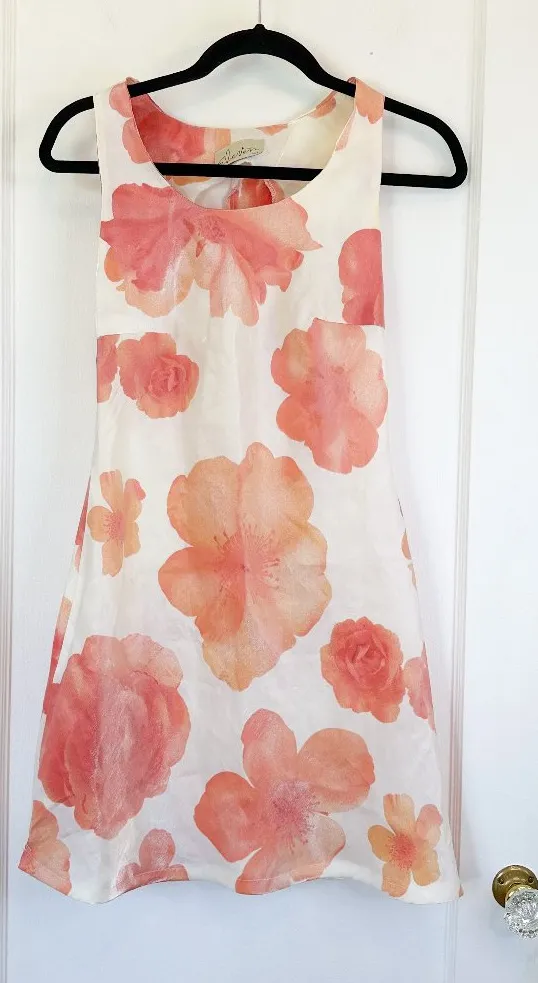 1-2 day ship time! ✨ Color: White base with pink, coral, and peach floral print Brand: Eleven Los Angeles Condition: Excellent vintage condition; smoke-free, pet-friendly home Size: No tag (fits Small/Medium) Pit to pit: 17" Length: 34" Lightweight sleeveless A-line mini dress with soft satin sheen and airy flow. Features oversized watercolor floral pattern in pink and coral tones, round scoop neckline, and racerback-inspired cut. Relaxed silhouette suits spring/summer parties, brunch, vacations, and daytime wedding guests. Keywords: satin fabric, A-line silhouette, Y2K style, 2000s fashion, vintage summer dress, brunch outfit, wedding guest, vacation wear, retro floral, feminine casual, spring fashion, lightweight fabric, effortless chic, beach day, garden party, timeless silhouette, pastel colors, feminine style