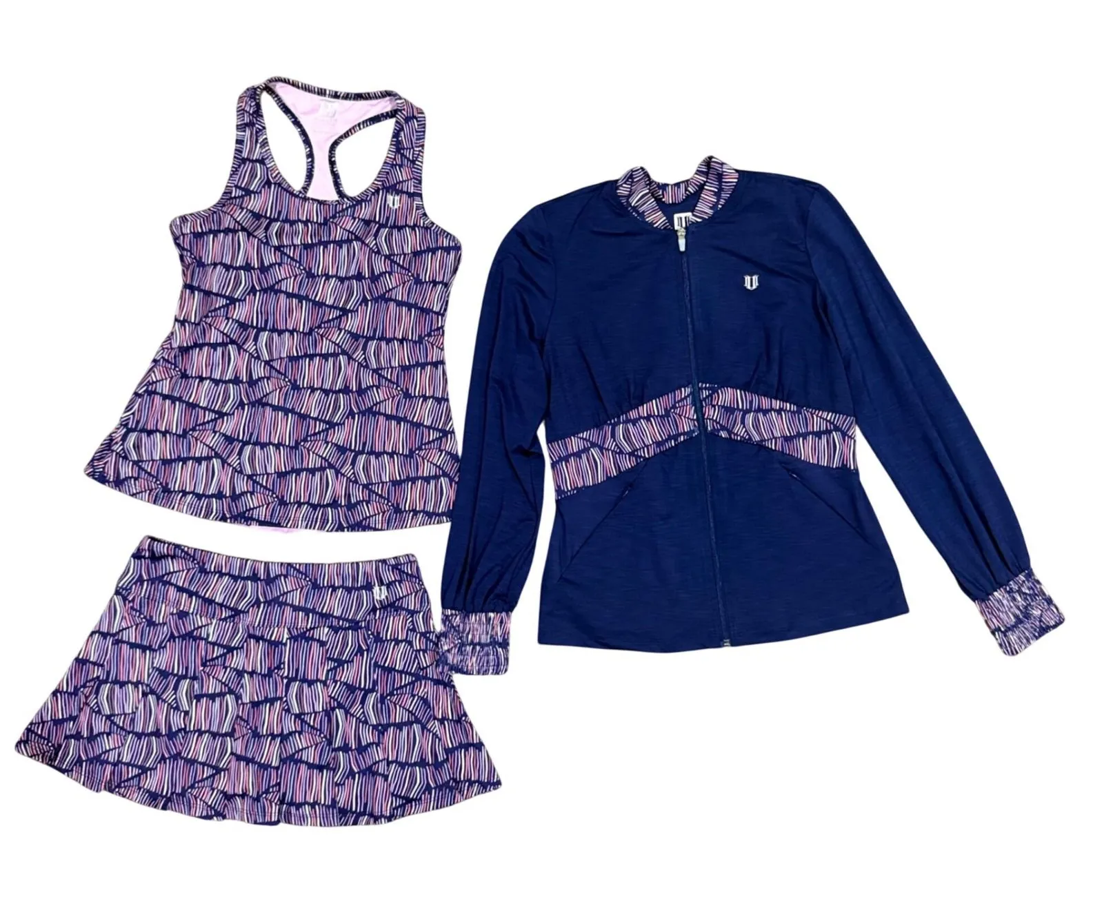 Unleash your inner athlete with this coordinated ELEVEN By Venus Williams activewear set. The vibrant purple tank top features a playful multicolored geometric/stripe pattern that extends to the matching skirt, designed for freedom of movement. Complementing the set is a matching zip-front jacket, accented with the same dynamic stripe pattern at the collar, cuffs, and a stylish waistband detail. This ensemble is perfect for a tennis, pickleball, or golf match, a brisk walk, or a casual day out. Measurements: • Tank Top Bust: 15 in • Tank Top Length: 22 in • Skirt Waist: 13.5 in • Skirt Length: 12 in (inseam of skirts 3") • Jacket Bust: 18.5 in • Jacket Length: 24.5 in • Jacket Sleeve Length: 24 in NEW without tags- never worn and never washed Set Includes: Tank, Skirt, Track Jacket Performance/Activity: Golf, tennis, pickleball Number of Pieces: 3 Piece Material: Polyester, Spandex Pattern: Striped Occasion: Activewear, Casual Features: Lightweight, Quick Dry, Pockets, Contrasting Trim Keywords: Venus Williams, tennis outfit, athletic wear, performance gear, sporty, workout set, active lifestyle, striped print, racerback tank, pleated skirt, zip jacket, athleisure, sport fashion, comfortable