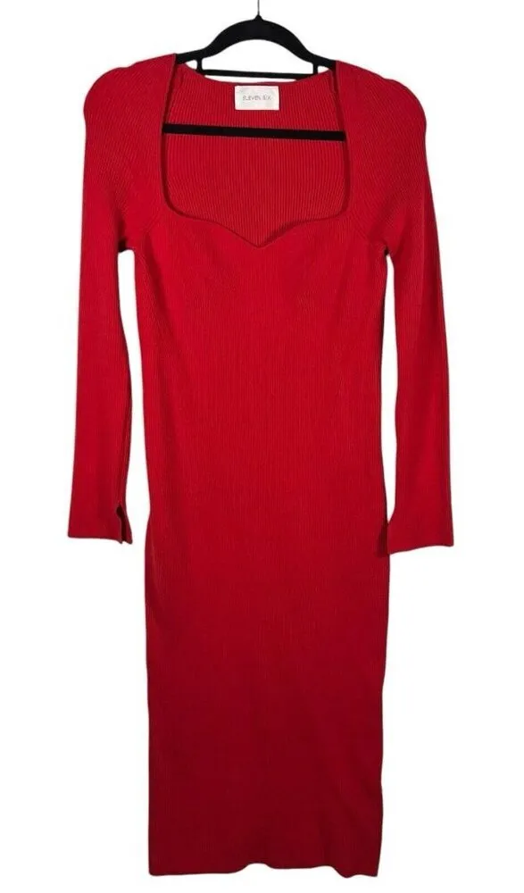 This Eleven Six dress is a cozy and stylish option for women in size medium. The garment features a flattering bodycon silhouette with a sweetheart neckline, long sleeves, and a pullover closure. The ribbed sweater maxi dress is made of a comfortable blend of cashmere, cotton, and cotton blend knit fabric in a vibrant red color. Perfect for parties or casual occasions, this dress has a slimming fit and stretchy material, making it suitable for all seasons.