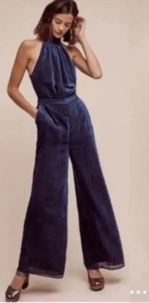 Elevenses By Anthropologie Blue Polka Dot Halter Neck Lined Jumpsuit Womens This chic jumpsuit from Elevenses by Anthropologie is a playful yet sophisticated piece. It features a blue and white polka dot pattern, a flattering halter neck, and a lined design for a smooth fit. Back zip Details: Brand: Elevenses by Anthropologie Style: Jumpsuit Color: Blue with velvet polka dots Size: Women's Size 2 Condition: Excellent pre-owned condition, gently worn and well cared for Material: 100% Polyester Care: Machine wash inside out This jumpsuit is a versatile and stylish addition to any wardrobe. Chic and perfect for holiday parties Approximate flat lay measurements Rise 13” Inseam 29” Bust 13” Waist 12.5”