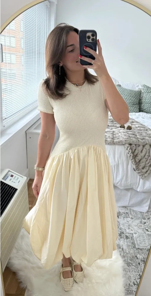 Details: – Mix media midi dress w/ a bubble hemline – Back zipper closure Composition + Care: – Polyester, elastane, cotton, nylon – Dry clean Condition: – Excellent condition with flaw – Small flaw on back Size and Color: – Size: X-Small – Color: Nude SKU # 11,901 Tags: Influencer Statement Piece, bridesmaids, black tie, gala, formal wear, prom, homecoming, pageant, wedding guest, bridal, wedding, bridal shower, mother of the bride, mother of the groom, rehearsal dinner, bachelorette, pageant, prom, homecoming, wedding, engagement photos, special occasion, little black dress, gala, Graduation, holiday parties, pageant, Quinceañera, formal, black tie, cocktail, Maid of honor, Special occasion, Designer Event, Dinner gown, Photo shoot, Formal event, Celebrity Red Carpet Luxe Luxury, Holiday, Vacation Resort wear, Beach dress, Spring, Summer, Fall, Winter