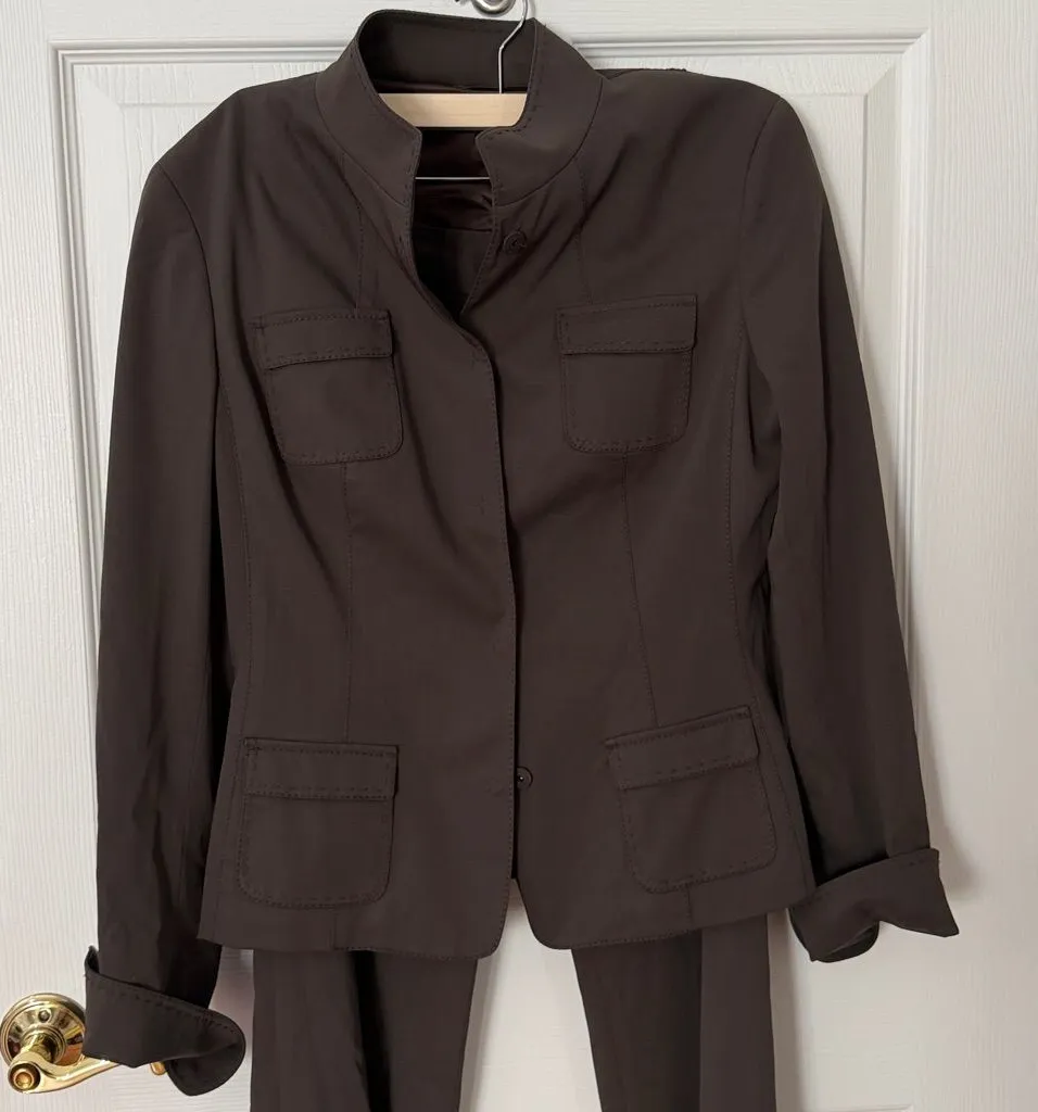 Sophisticated chocolate brown suit by Elie tahari. Ideal for professional settings. Pants are wide leg and measure 17 inches across the waist. Fit like a size 10/12. Military style blazer with snap button closure fits like a medium or size 8. Perfect condition.