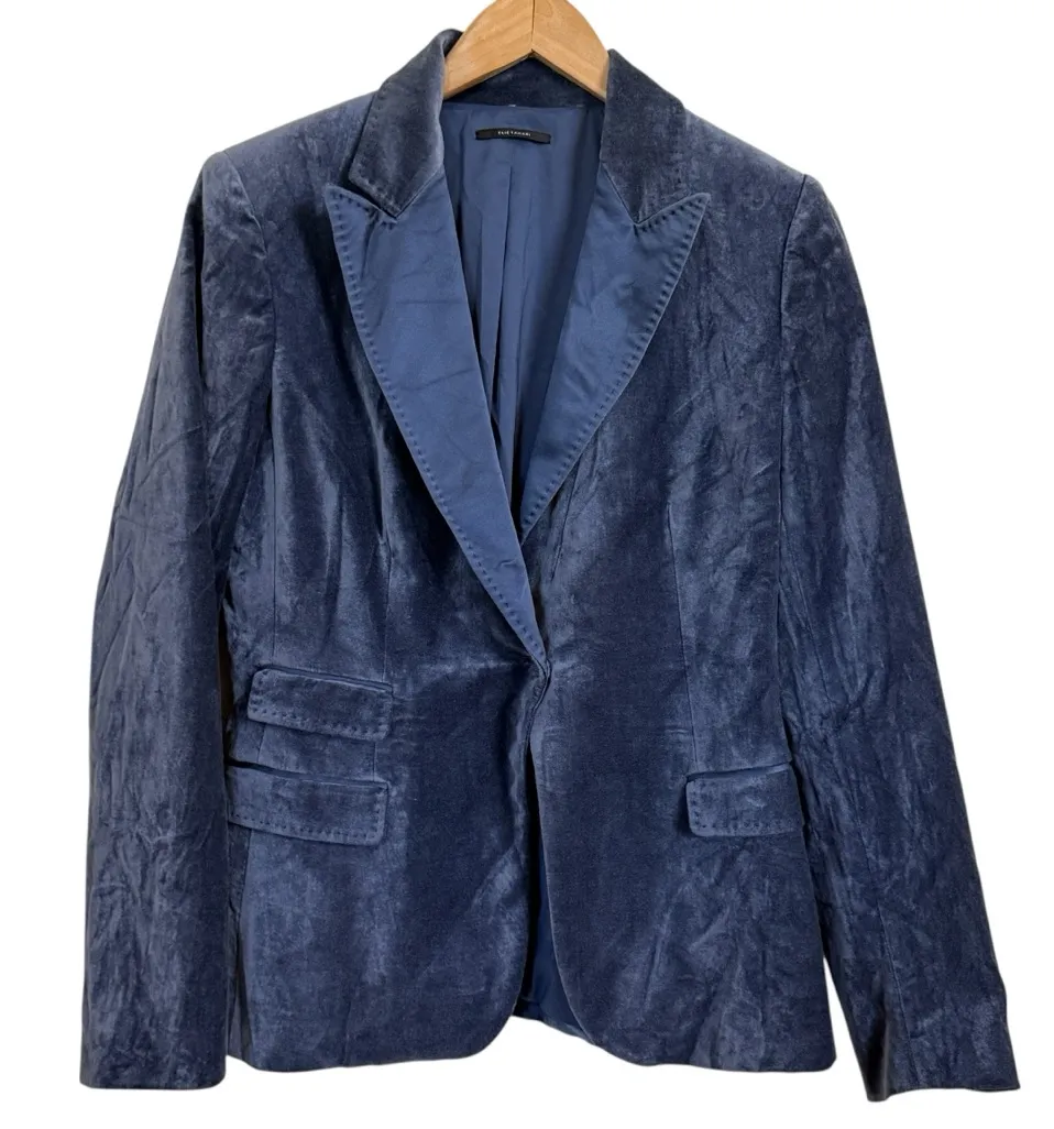 Elie Tahari Classic Blue Velvet Blazer Single Snap Closure, Size 10 Please see measurements in pictures This classic blazer has a snap closure on the inside. The pockets are faux. It has built in shoulder padding for added structure. It is in great used condition.