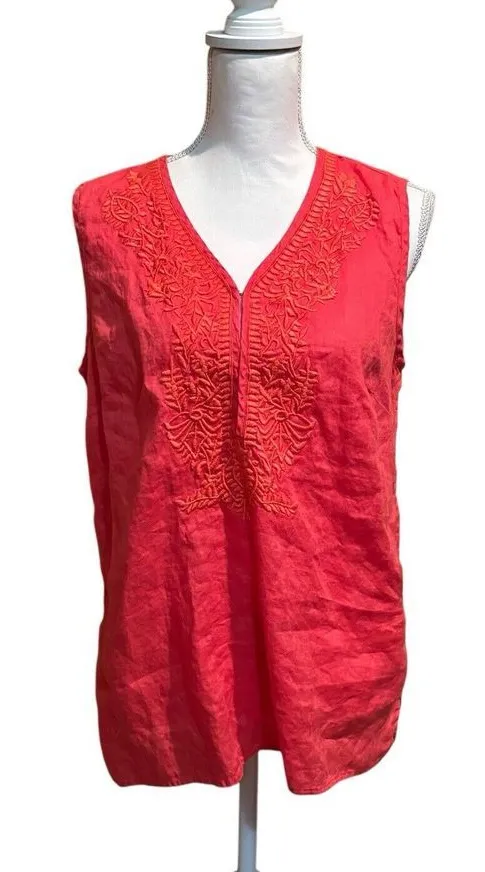 Elite Tahari size‎ Large island hibiscus tank top v-neck 100% linen embroidered Orange - $19 - From Beth