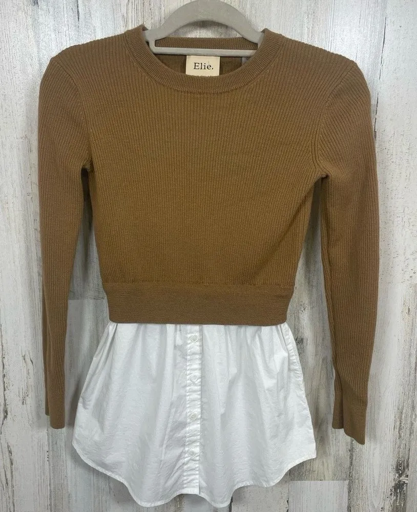 Elie Tahari Sweater Shirt Womens Small S/P Brown White Ribbed Knit Layered Combo Condition: Good condition. The sweater has some piling that can be resolved with a sweater shaver. Size: Small S/P Material: 100% Merino Wool, Combo: 97% Cotton, 3% Elastane Features: Ribbed Knit Top, Long Sleeve, Layered Design, Button Placket, Curved Shirt Hem Measurements: Pit to pit: 15” plus stretch Shoulder to hem: 28” Tag: Womens, Merino, Cotton, Office, Casual, Fall, Preppy, Chic, Workwear. Lagenlook