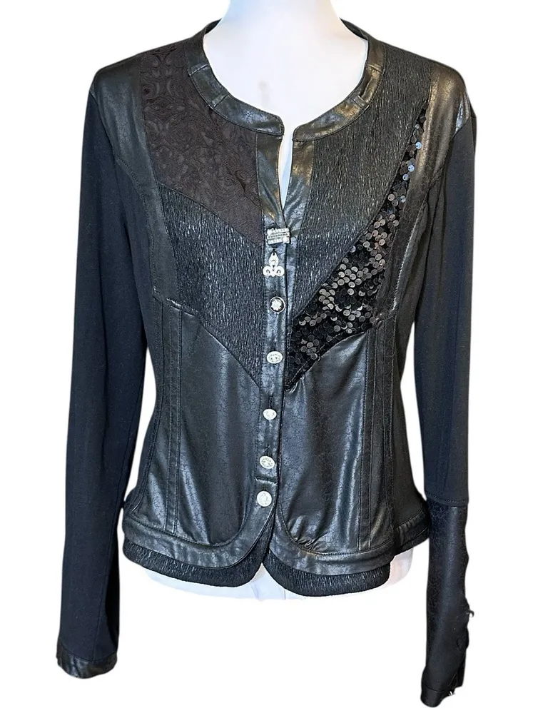 Mixed media women’s black faux leather button front jacket. Lace & sequin detailing. Both arm hems are different. Corset lace up detailing on back. Fitted. No pockets. That knit material is stretchy jersey material. Italian size large. Please see measurements prior to purchasing to ensure proper fit Pit to pit 18” Length 22” Sleeves 25”